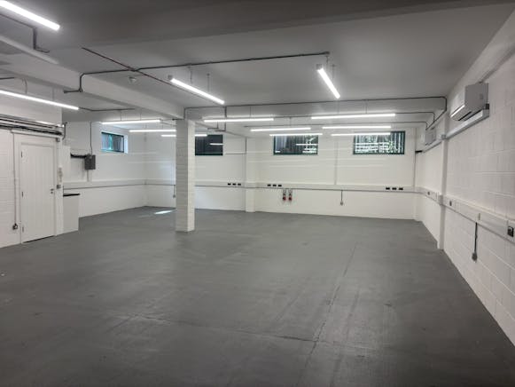 Self-contained ground floor open plan business space with first-floor offices. The ground floor consists of dado trunking, electric roller shutter, air conditioning and a WC. The floor-to-ceiling height is 2.7 meters. The first floor is currently used as office space. There is a glass partition to the front. Perimeter trunking can be found throughout, with three air conditioning units. There is also a kitchenette and wc. Four further car parking spaces can be provided at an additional cost and a separate license, subject to availability.