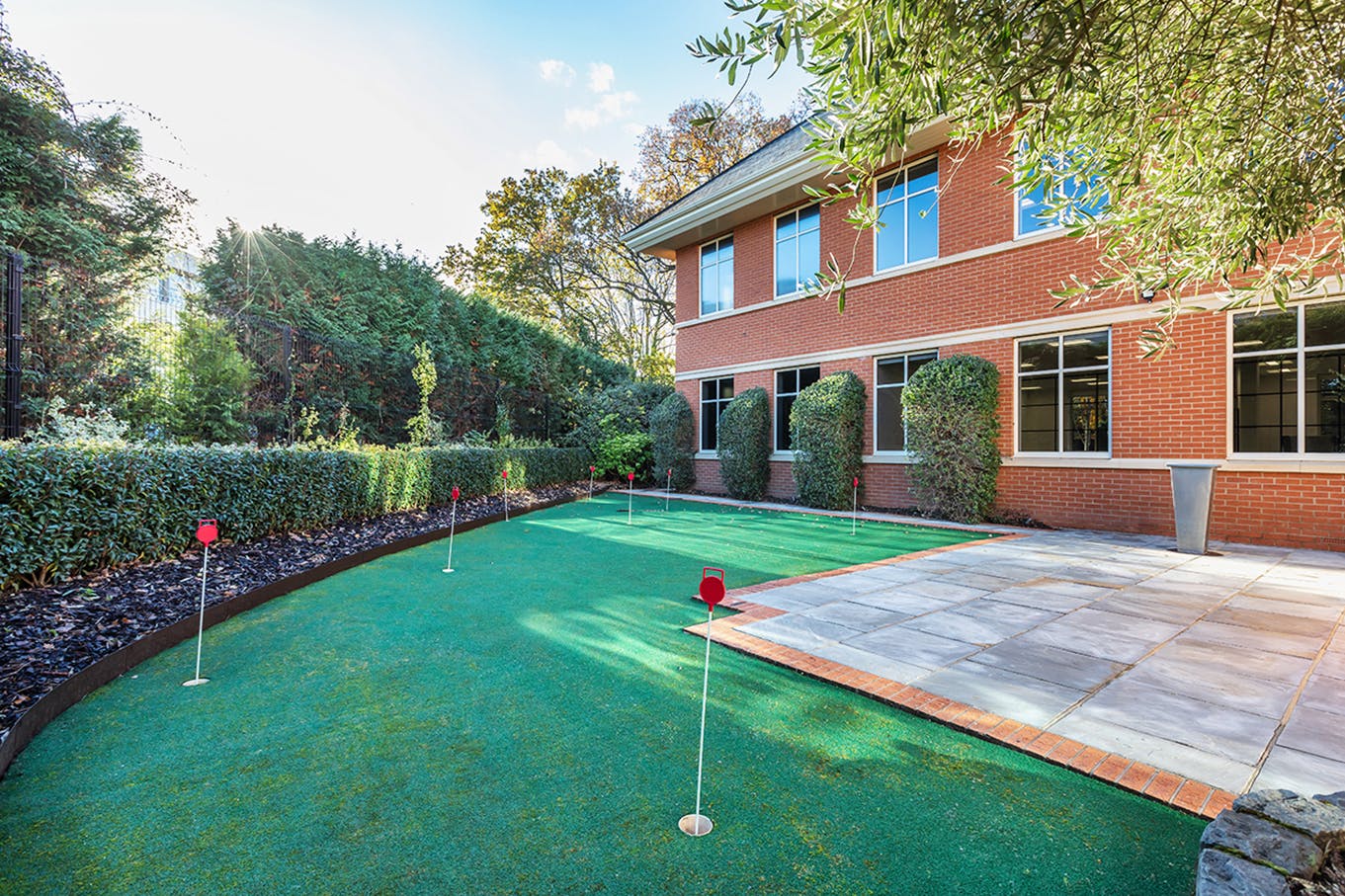 The Mill has a striking reception area featuring a double-height atrium and a feature staircase. The ground floor is thoughtfully designed with meeting rooms and a business lounge, while the kitchen and breakout offer informal areas for collaboration. The upper floors provide bright, open-plan office accommodation finished to the highest standard. The top floor is particularly unique, boasting vaulted ceilings that flood the space with natural light. Externally, the property offers a secure and professional setting, accessed via gated entry. The grounds are well maintained, featuring gardens and a putting green, ideal for outdoor relaxation or lunchtime activity. The site also benefits from excellent parking facilities, with space for 37 vehicles.